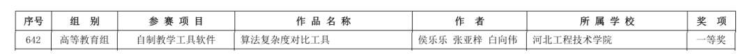 近日,河北省教育厅公布了“2025年河北省教师数字素养提升实践活动”评选结果。我校人工智能学院选送的“自制教学工具软件”赛道作品——“算法复杂度对比工具”,凭借创新设计与实用价值一举斩获一等奖,并且被推荐参加国赛。这件作品由侯乐乐老师团队设计并完成,聚焦教学痛点,以数字化工具破解算法教学中的抽象难点,既彰显了学院教师在教育数字化领域的探索深度,也为学科教学与技术工具的融合提供了鲜活范例。